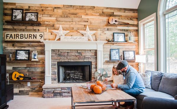 Panel kayu dengan berbagai ukuran yang berbeda. Hal yang membuat ruang tamu ini unik adalah penempatannya, daripada meletakkan semua panel tersebut secara berdampingan, ruangan yang satu memasangnya secara kreatif dengan tumpang tindih, memberikan ruang yang cukup untuk menempatkan beberapa pencahayaan tersembunyi.